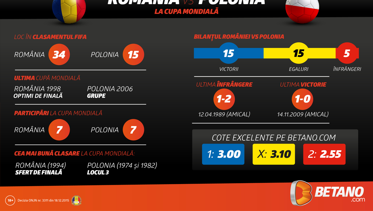 Sub conducerea germanului Christoph Daum, România este favorită la casele de pariuri, Betano.com oferind o cotă de 3.00 pentru victoria noastră. Tricolorii au şansa de a menţine tradiţia invincibilităţii de după Revoluţie şi a continua evoluţia rezultatelor pozitive în faţa Poloniei.