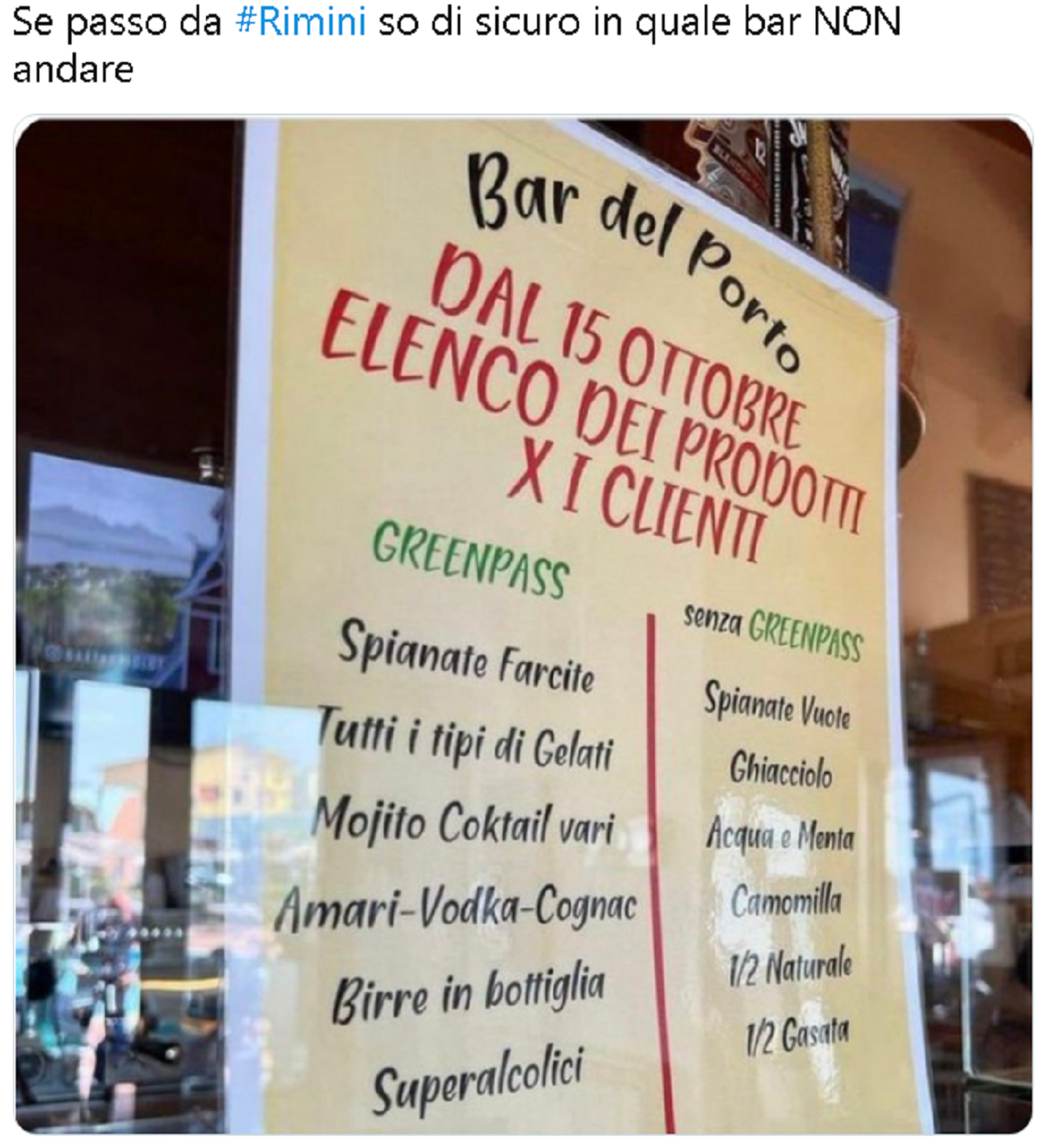 Davide Giovannetti a afișat meniuri separate, în vigoare din 15 octombrie, în localul lui din orașul italian Cattolica. Italia a introdus, din 15 octombrie, obligativitatea certificatului verde (green pass) pentru toți angajații publici și privați. Gluma nu a fost pe placul multor persoane, iar ca urmare, bărbatul a primit o serie de amenințări. O femeie chiar a părăsit localul când a văzut meniul.