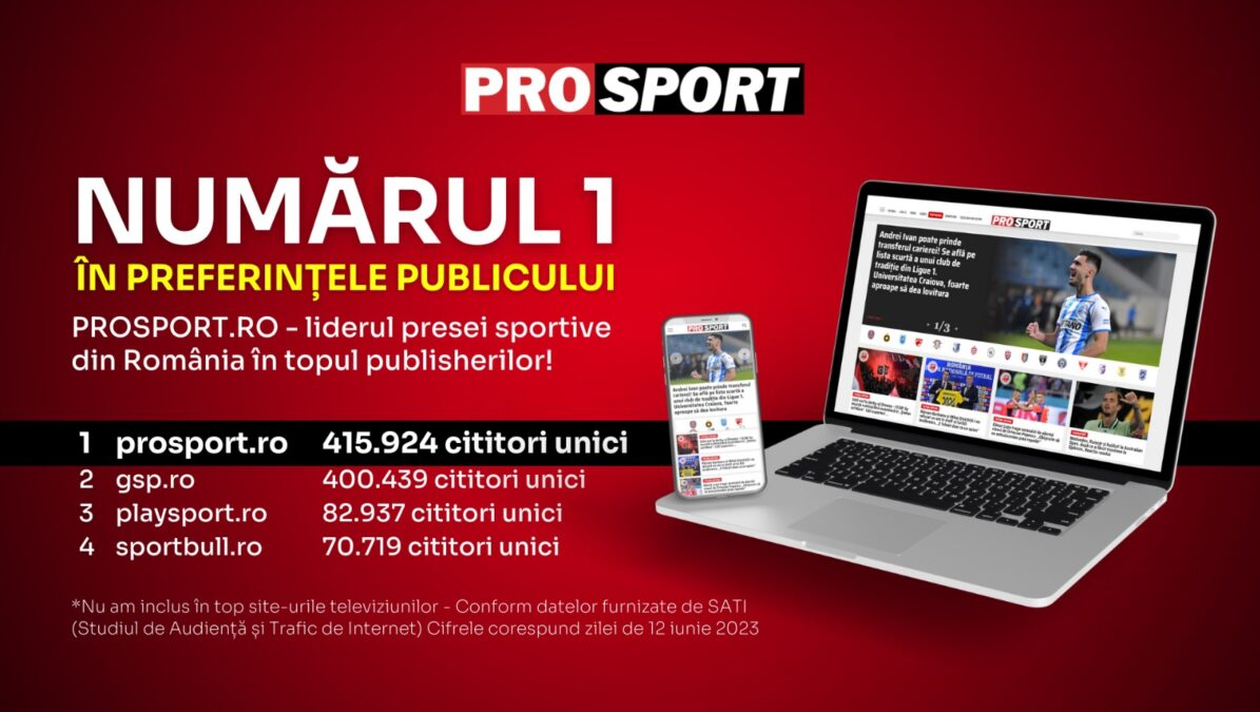 Site-ul de știri sportive www.prosport.ro, aparținând grupului de presă GÂNDUL MEDIA NETWORK, s-a situat pe primul loc în ceea ce privește numărul de cititori (clienți) unici în domeniul SPORT, în data de 12 iunie 2023, exceptând site-urile televiziunilor.