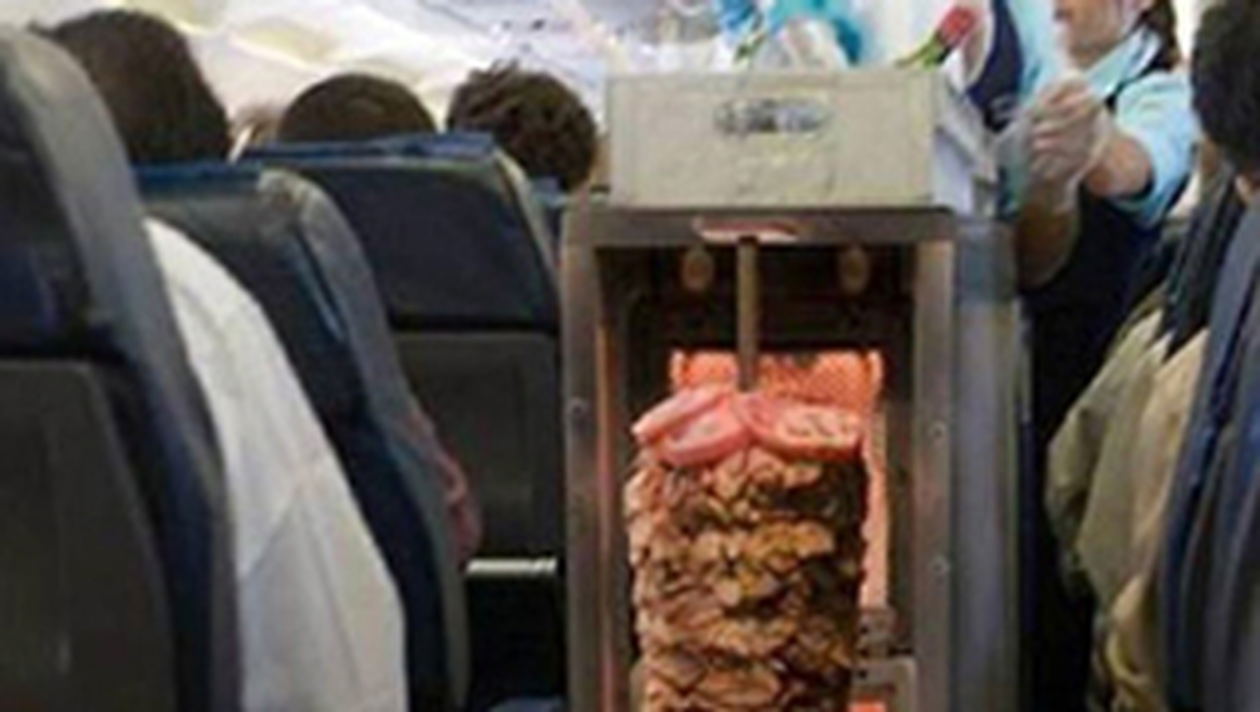 Cum unii nu vor sa se desparta de mancarea grasa si uleioasa nici in avion au gasit o solutie pentru a rezolva aceasta problema. Au facut un carucior special, care poate sustine carnea de saorma gata pentru a fi servita.
