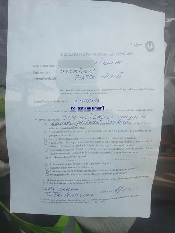 Pe 19 aprilie, pe Facebook, pe contul “Poliţiştii au umor“, a fost postată declarația pe propria răspundere a lui Nicolae, un bărbat din Piatra Neamț. Numele lui de familie este blurat, la data nașterii este scris “scorpion”, la adresa locuinței – Piatra Neamț, iar la locul deplasării – România.