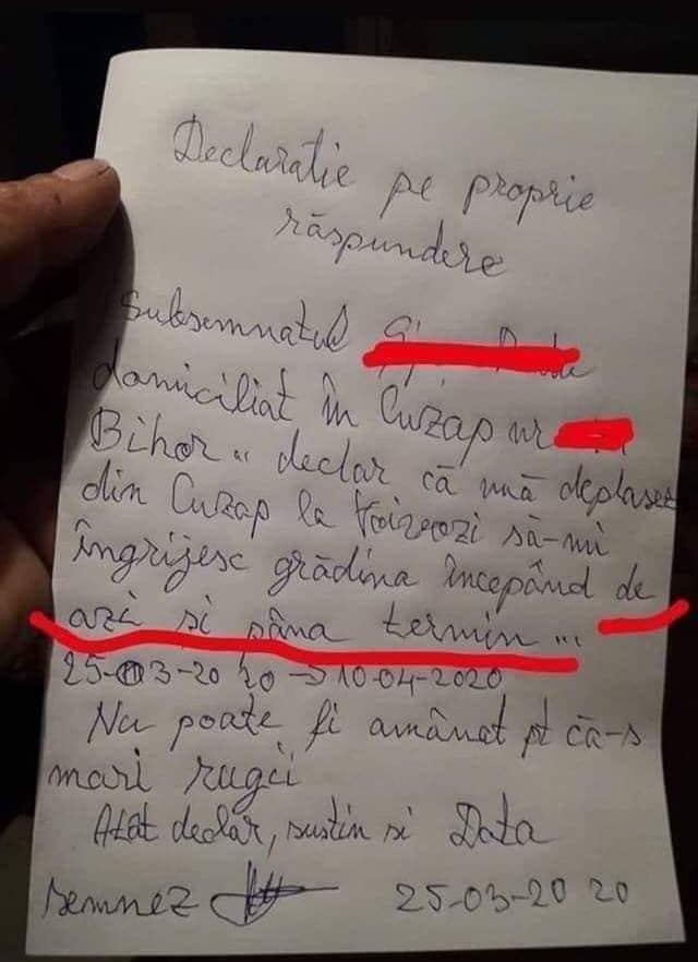 Un tânăr din Bihor s-a conformat măsurilor impuse de criza coronavirusului care a făcut deja 24 de victime în țara noastră, așa că și-a completat – cum a putut el mai bine, de altfel – declarația pe propria răspundere. Tânărul a specificat unde locuiește și a menționat că merge la Voievozi pentru a-și ”îngriji grădina”. Numai că atunci când a trebuit să menționeze și intervalul de timp de care va avea nevoie, totul a devenit demn de o informație virală.