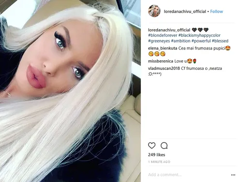 „#blondeforever #blackismyhappycolor #greeneyes #ambition #powerful #blessed (n.r.: #blondăpentrutotdeauna #negruleculoareameafericita #ochiverzi #ambitie #puternica #binecuvantata)”, a scris Loredana Chivu în dreptul selfie-ului postat pe pagina ei de Instagram.