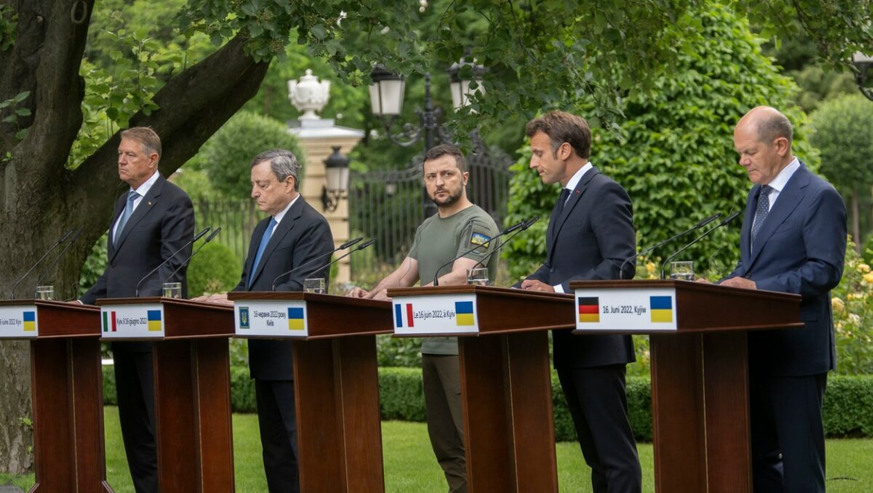 Emmanuel Macron şi Klaus Iohannis, premierii german Olaf Scholz şi italian Mario Draghi au fost primiţi joi, la palatul prezidenţial, la Kiev, de către preşedintele ucrainean Volodimir Zelenski.