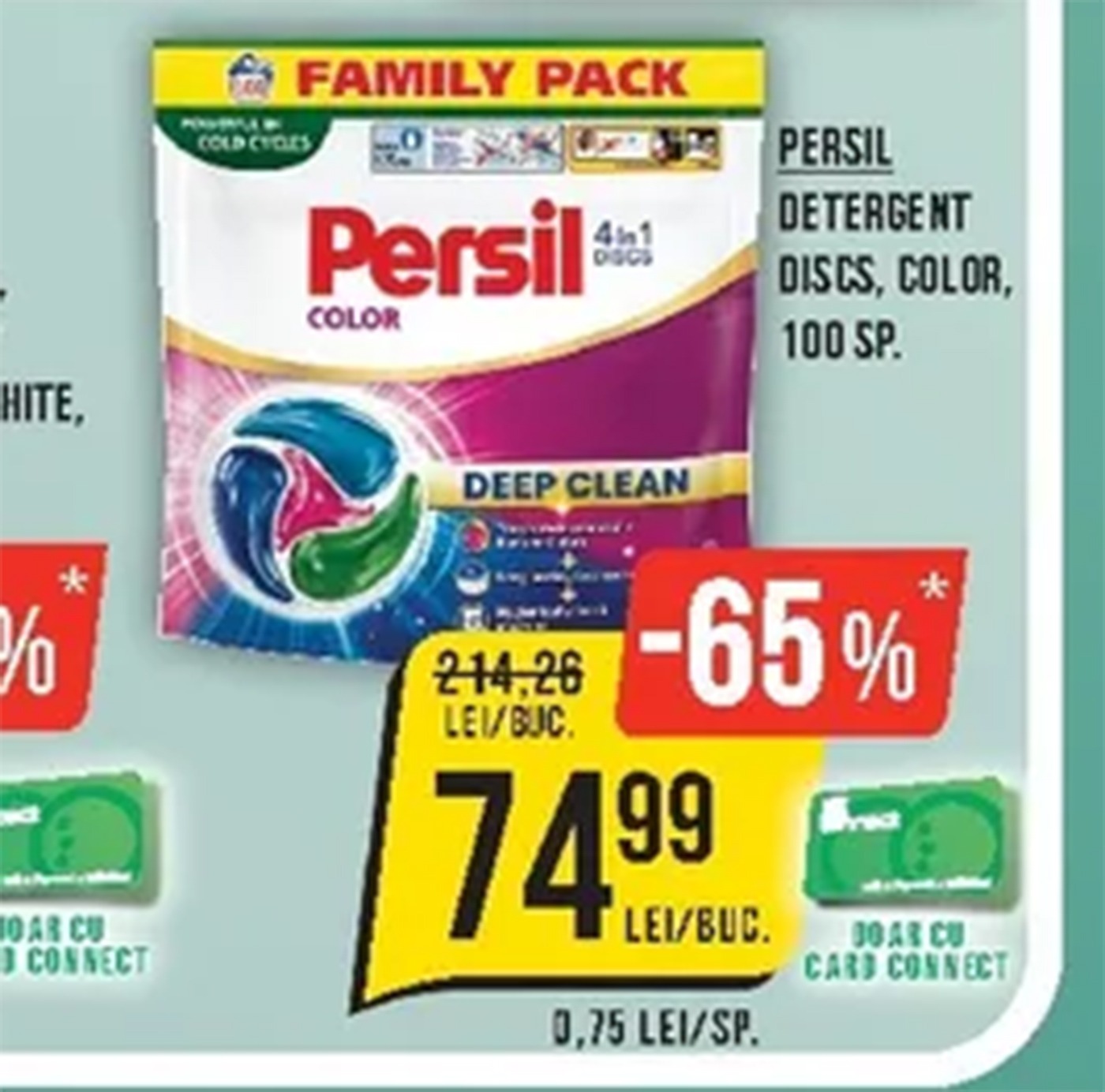 Retailerul Mega Image vine în această primăvară cu o promoție atractivă pentru clienții săi. Detergentul Persil Color, în varianta Family Pack cu 100 de capsule, beneficiază de o reducere de 65%. Prețul produsului a scăzut semnificativ, de la 214,26 lei la doar 74,99 lei. Astfel, reprezintă o oportunitate excelentă pentru cei care vor să facă economii fără a renunța la calitate.