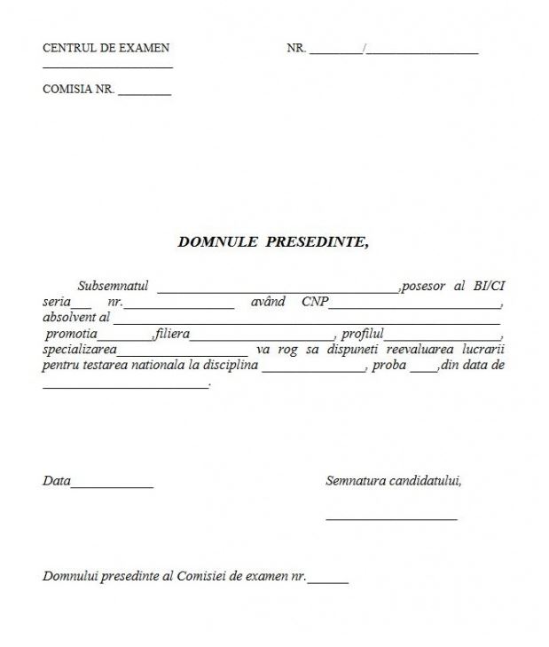 Pentru a depune contestație pentru notă la Evaluarea Națională 2019, elevii trebuie să completeze o cerere adresată președintelui comisiei de contestații în care vor cere reexaminarea lucrării.