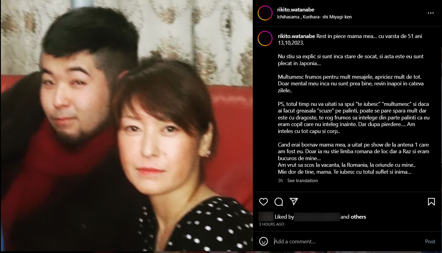 „Rest in peace, mama mea… cu vârsta de 51 ani 13.10.2023. Nu știu să explic și sunt încă în stare de șoc… eu sunt plecat ăn Japonia… Mulțumesc frumos pentru mesaje, apreciez mult de tot. Doar mental încă nu sunt prea bine, revin înapoi în câteva zile… P.S. Tot timpul nu uitați să spuneți “te iubesc”, “mulțumesc” și dacă ai făcut greșeală, “scuze”. Poate ți se pare mult, dar este cu dragoste… (…) Când era bolnavă mama mea, s-a uitat la show-ul de la Antena 1 în care am fost eu. Doar ea nu știa limba română deloc, dar a râs și era bucuroasă de mine…(…) Mi-e dor de tine, mamă. Te iubesc cu tot sufletul și inima…”, este mesajul notat de Rikito Watanabe pe Instagram.