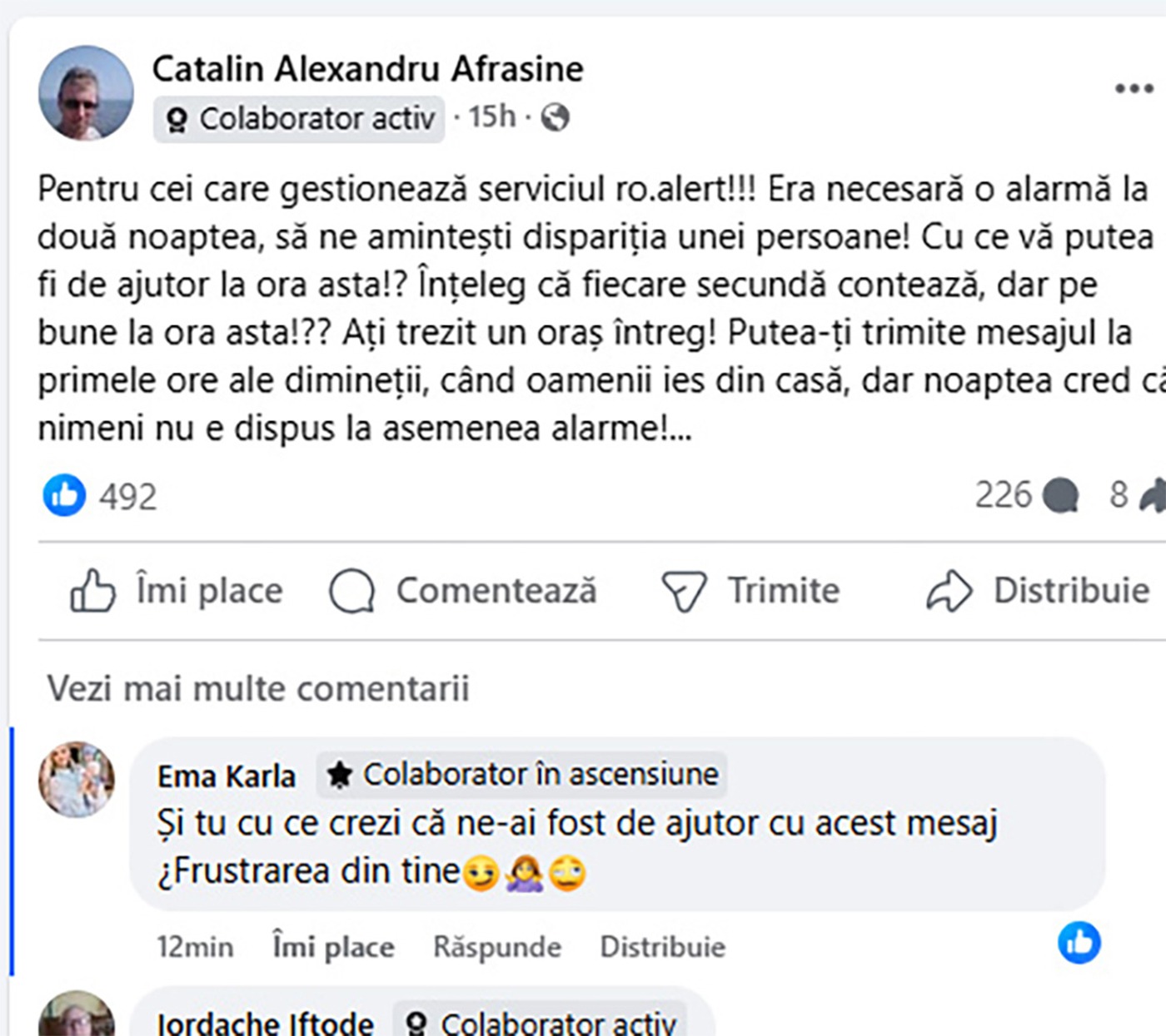 “Pentru cei care gestionează serviciul ro.alert!!! Era necesară o alarmă la două noaptea, să ne amintești dispariția unei persoane! Cu ce vă putea fi de ajutor la ora asta!? Înțeleg că fiecare secundă contează, dar pe bune, la ora asta!?? Ați trezit un oraș întreg! Puteați trimite mesajul la primele ore ale dimineții, când oamenii ies din casă, dar noaptea cred că nimeni nu e dispus la asemenea alarme!…”, a pornit discuția un bârlădean.