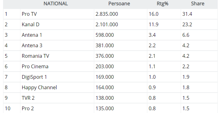 De cealaltă parate, pe Antena 1 a rulat filmul Lucy, care a scos cifre modeste: nici măcar 600.000 de telespectatori la nivel național, pe intervalul Românii au talent.