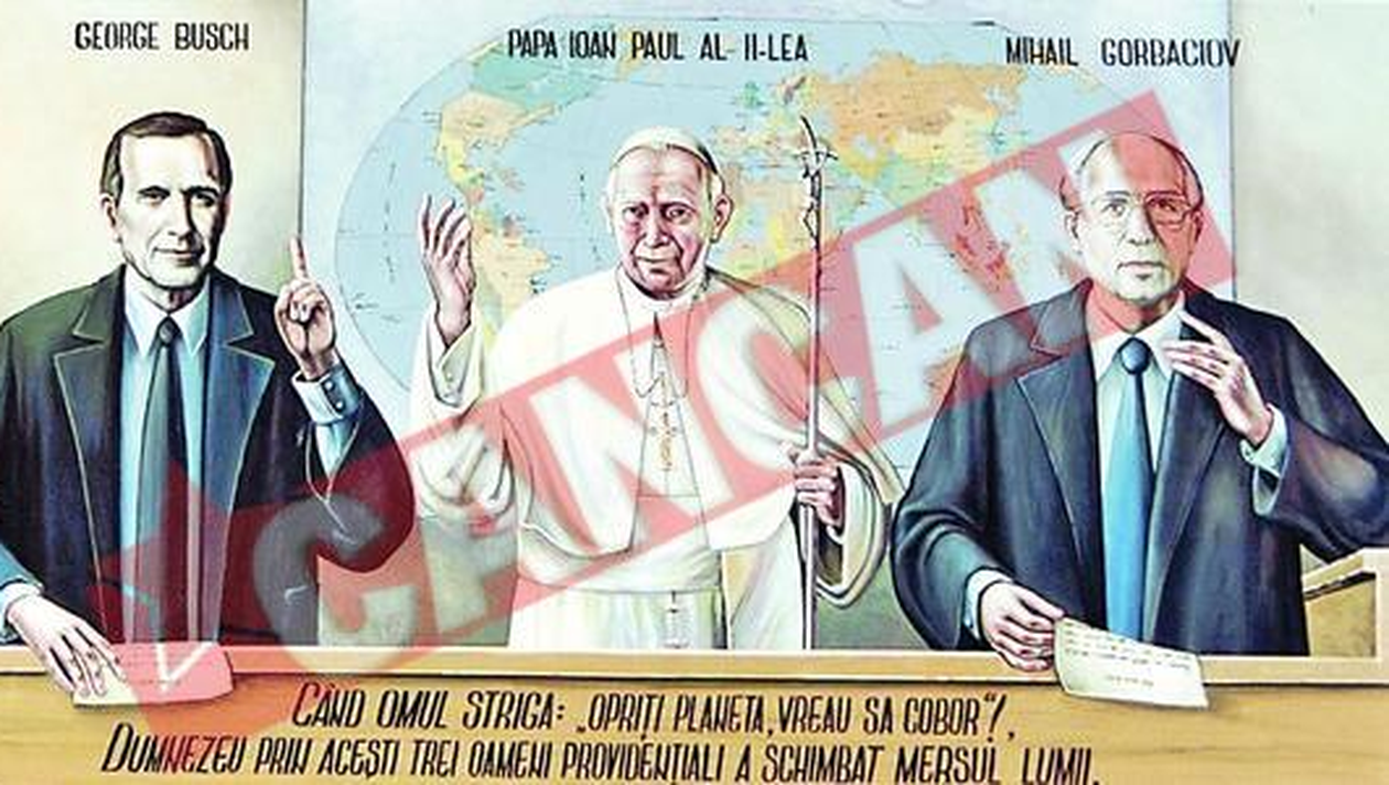 APRECIATI. Preotul crede ca Bush senior, Papa si Gorbaciov sunt sfintii care au ajutat la caderea comunismului George Bush senior, Papa Ioan Paul al II-lea si Mihail Gorbaciov stau laolalta, la loc de cinste, intr-o… biserica din Alba. In locul icoanelor, pe pereti sunt pictate cele trei personalitati. Enoriasii vin, se inchina, se roaga. Preotul a sustinut ca a avut ideea nastrusnica de a-i picta pe cei trei in marime naturala pentru ca ei sunt cei care au schimbat cursul istoriei si au contribuit la caderea comunismului. Preotul din Petresti, Alba, a sperat ca, odata cu summitul, presedintele Bush Jr. sa-si faca timp sa viziteze si lacasul de cult din localitatea lor si sa-si vada tatal, asezat la loc de cinste, printre sfinti. (L.N.)