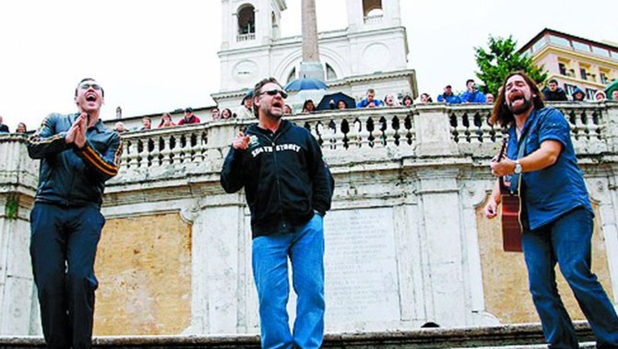 Inedit. Reputatul actor Russell Crowe, in varsta de 46 de ani, a oferit un concert-surpriza in Piazza di Spagna din Roma, impreuna cu trupa sa, Merry Man, compusa din cativa dintre actorii alaturi de care joaca in cea mai recenta pelicula a sa – „Robin Hood”. „Suntem trupa Merry Man si vrem sa va cantam ceva”, asa le-a spus Russell trecatorilor ce se aflau in zona, care s-au oprit si, timp de 15 minute, au ascultat cateva melodii interpretate de banda starului, printre care si „Man in the Mirror” a regretatului Michael Jackson.