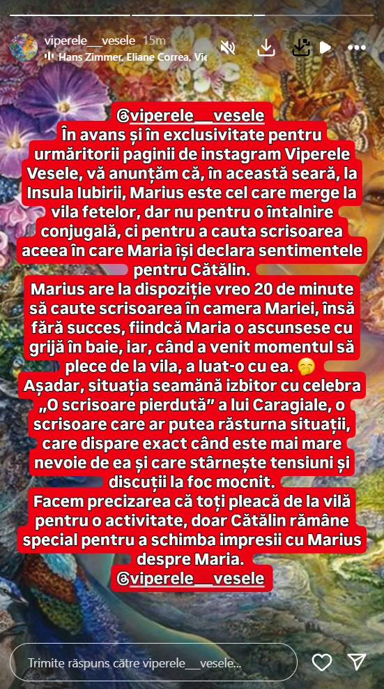 Recent, pagina de Instagram Viperele Vesele a anunțat că bărbatul care primește dreptul de a merge în vila fetelor este Marius Avram. Nu s-a mai întâmplat așa ceva până acum la Insula Iubirii. Bărbatul are la dispoziție 20 de minute să găsească scrisoarea pe care Maria a scris-o pentru Cătălin.