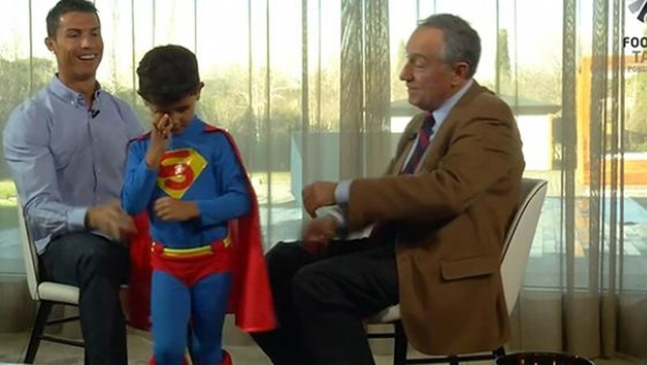 Cristiano Ronaldo, castigatorul Balonului de Aur 2014, a fost interrupt de fiul sau in timpul unui interviu. Ronaldo Jr a intrat peste tatal sau imbracat in costum de Superman.