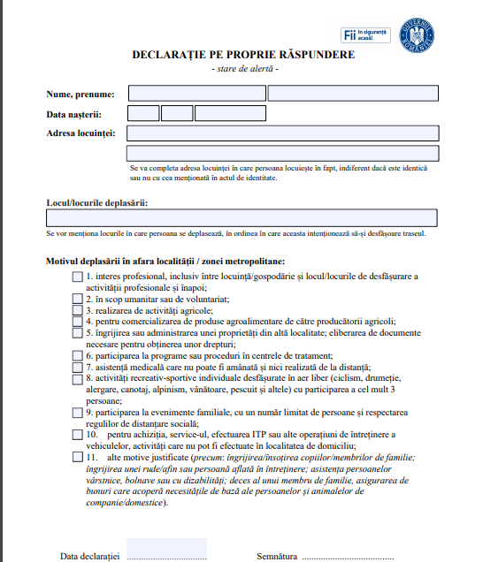 Declarația necesară celor care vor să se deplaseze în afara localităților în care locuiesc a fost actualizată de autorități. Astfel, la punctul 11 a fost completată secțiunea „îngrijirea unei persoane” cu exemplul „afin”. (VEZI ȘI: CE ÎNSEAMNĂ ZONA METROPOLITANĂ? CELE 22 DE ZONE DIN ROMÂNIA ÎN CARE NU AI NEVOIE DE DECLARAŢIE PE PROPRIE RĂSPUNDERE PENTRU A CIRCULA)
