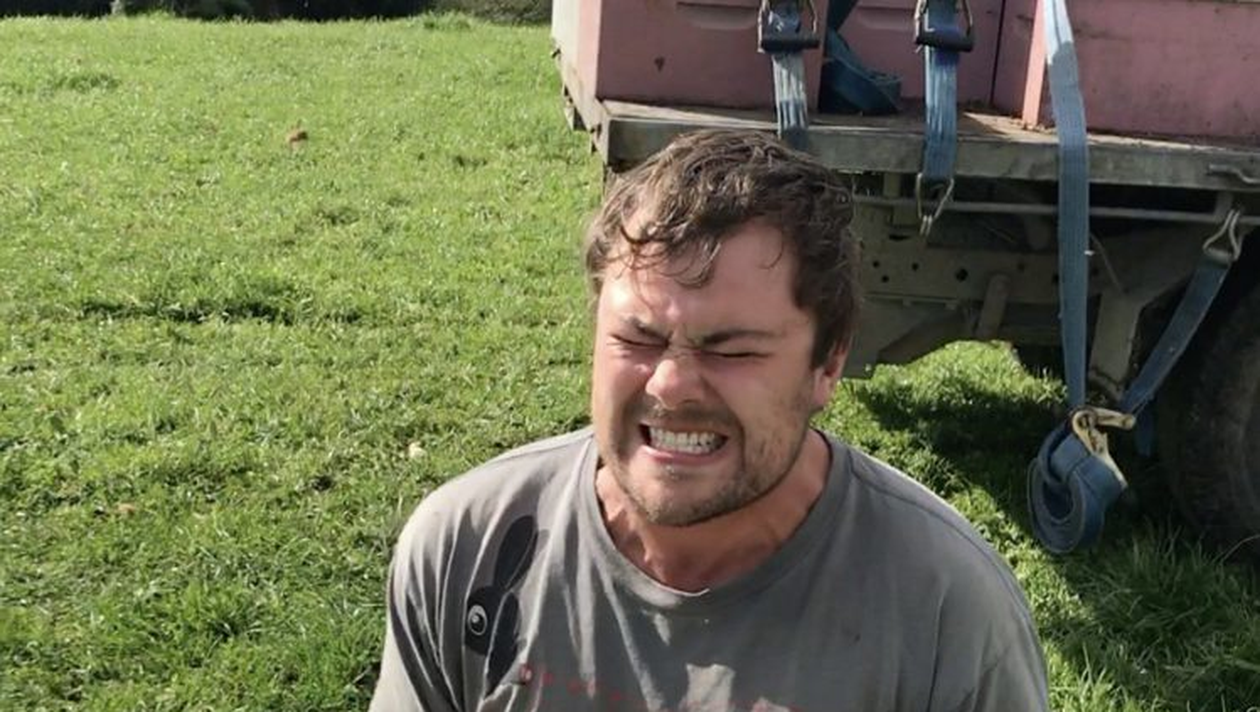 Numele lui este Jamie Granger si este crescator de albine. Acesta a fost provocat sa stea cu fundul gol-pusca pe un stup de albine. Evident, insectele ii apartineau. Nu a stat prea mult pe ganduri si a facut-o.