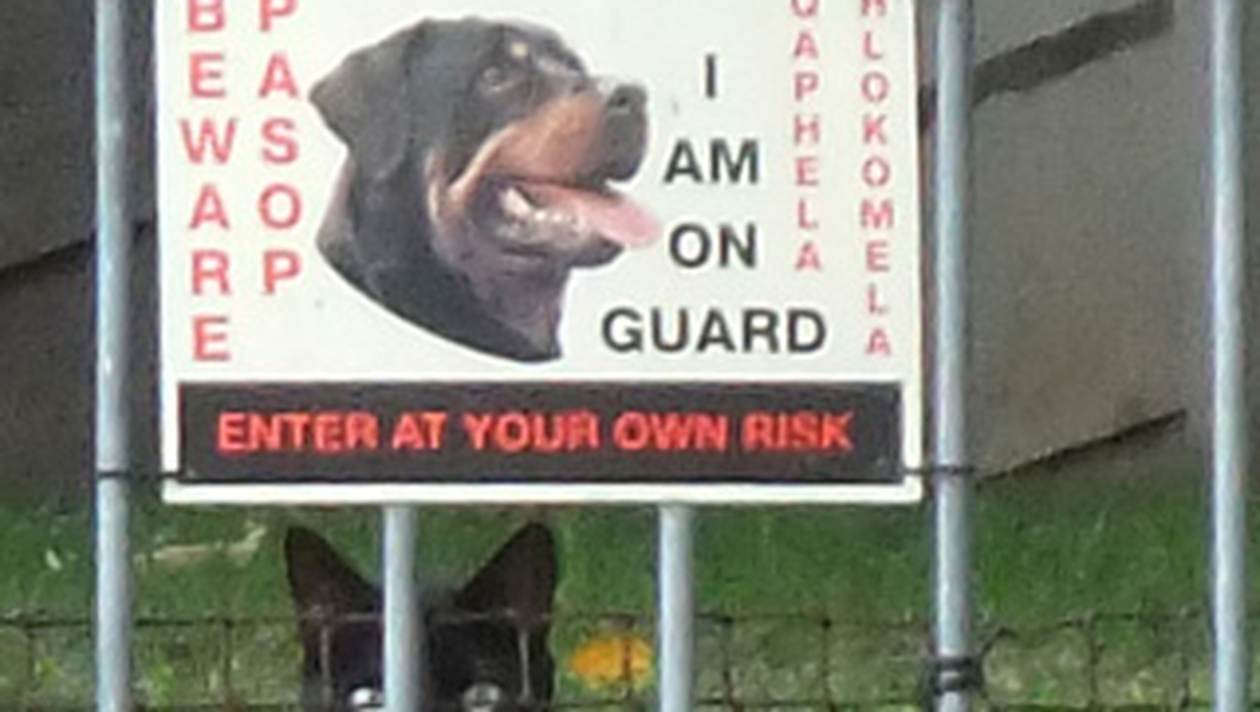 Fotograful canadian Alla Lifchits se afla intr-o calatorie la Richards Bay, in Africa de Sud, cand a surprins o imagine inedita. In spatele unui gard pe care era atarnat un semn ce infatisa un caine rotweiller, pentru a atrage atentia nepoftitilor sa nu incalce proprietatea cu pricina, se afla o pisica de culoare neagra. Aflata probabil intr-o criza de identitate, felina s-a pus de paza fix sub semnul cu pricina. Desi fotograful a stat destul de mult in zona, in curtea in care se presupunea ca este de paza un rotweiller nu a aparut niciun caine, pisica ocupandu-se linistita de serviciul de paza in locul patrupedului.