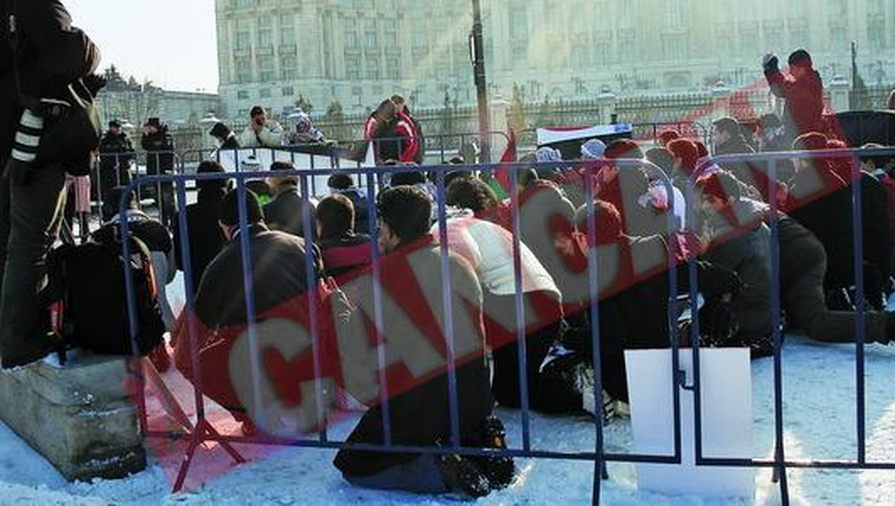 Incepand cu ora 10.00, in fata guvernului s-au adunat aproximativ 150 de persoane, crestini si musulmani, pentru a protesta impotriva actiunii militare a Israelului. Cum protocolul incheiat intre organizatori si autoritati prevedea ca steagurile si pancartele cu mesaje indreptate impotriva Israelului vor fi interzise, multi dintre participanti, in special musulmani, s-au declarat dezamagiti de organizare, unii chiar preferand sa paraseasca mitingul. In jurul orei 13.00 mitingul s-a mutat in Parcul Izvor, chiar in fata Palatului Parlamentului. Aici, cele aproximativ 100 de persoane au fost „plasate” intr-un tarc inconjurat de jandarmi. Tinerii musulmani au strigat minute in sir impotriva razboiului, dar si a Israelului. La un moment dat, ca la un semn, barbatii s-au intors spre stanga, iar femeile s-au retras mai in spate. S-au rugat impreuna in memoria mortilor din Gaza si au strigat disperati numele lui Allah.