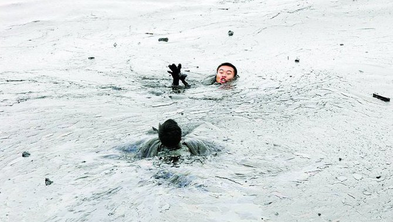 Cu trupul acoperit din cap pana in picioare de petrol, lipsit de vlaga si abia respirand, pare o creatura din alta lume. Nici nu ai zice ca e om, ci un personaj dintr-un film de groaza. Cam asa ar putea fi rezumata starea in care s-a aflat un pompier chinez, in urma cu cateva zile, cand, impreuna cu 1.999 de colegi, a fost mobilizat pentru a stinge un incendiu in portul chinez Dalian. Barbatul, care a fost trimis sa se lupte cu flacarile, dar si sa repare cele doua conducte de petrol din Marea Galbena care au provocat catastrofa, s-a chinuit o vreme cu valurile uleioase si negre, dar, intr-un final, acestea l-au doborat. Incapabil sa isi mai miste bratele si picioarele, coplesit de petrolul care ii acoperea trupul, pompierul a fost la un pas sa se inece. Norocul lui ca a fost observat de un coleg, care nu a ezitat sa isi puna in pericol propria viata pentru a-l salva. Ajuns pe mal, dupa ce a fost carat in spate zeci de metri, pompierul a fost asaltat de ceilalti colegi, care s-au straduit sa-i acorde primul ajutor.