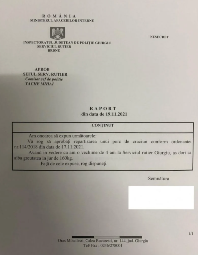 Tânărul poliţist le-a cerut superiorilor să ia în calcul vechimea sa de 4 ani și să-i repartizeze un porc de 160 de kilograme. „Am onoarea să expun următoarele: Vă rog să aprobaţi repartizarea unui porc de Crăciun, conform Ordonanţei nr. 114/2018 din data de 17.11.2021. Având în vedere că am o vechime de 4 ani la Serviciul Rutier Giurgiu, aş dori să aibă greutatea în jur de 160 kg. Faţă de cele expuse, rog dispuneţi”, se arată în cererea agentului de poliţie.