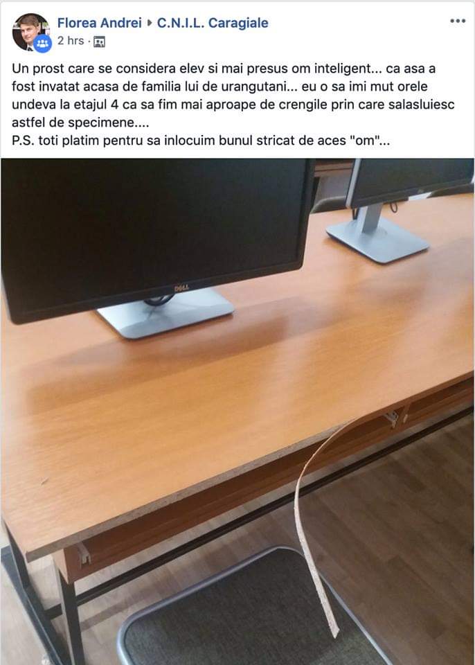 ”Un prost care se consideră ele și mai presus om inteligent… că așa a fost învățat acasă de familia lui de urangutani… eu o să îmi mut orele undeva la etajul 4 ca să fim mai aproape de crengile prin care sălășluiesc astfel de specimene… P.S. toți plătim pentru să înlocuim bunul stricat de aces (n.r. – domnului profesor i-a scăpat o literă) om”.