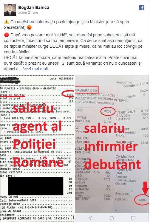 Bogdan Bănică a postat pe pagina de Facebook fluturaşii de salariu din care rezultă că un infirmier debutant câştigă mai mulţi bani decât un poliţist cu zece ani vechime, potrivit stirileprotv.ro.