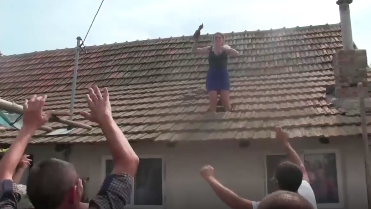În imagini, o femeie este ajutată a fi urcată pe casă şi sub uralele nuntaşilor începe să arunce cu ţigla de pe casă.