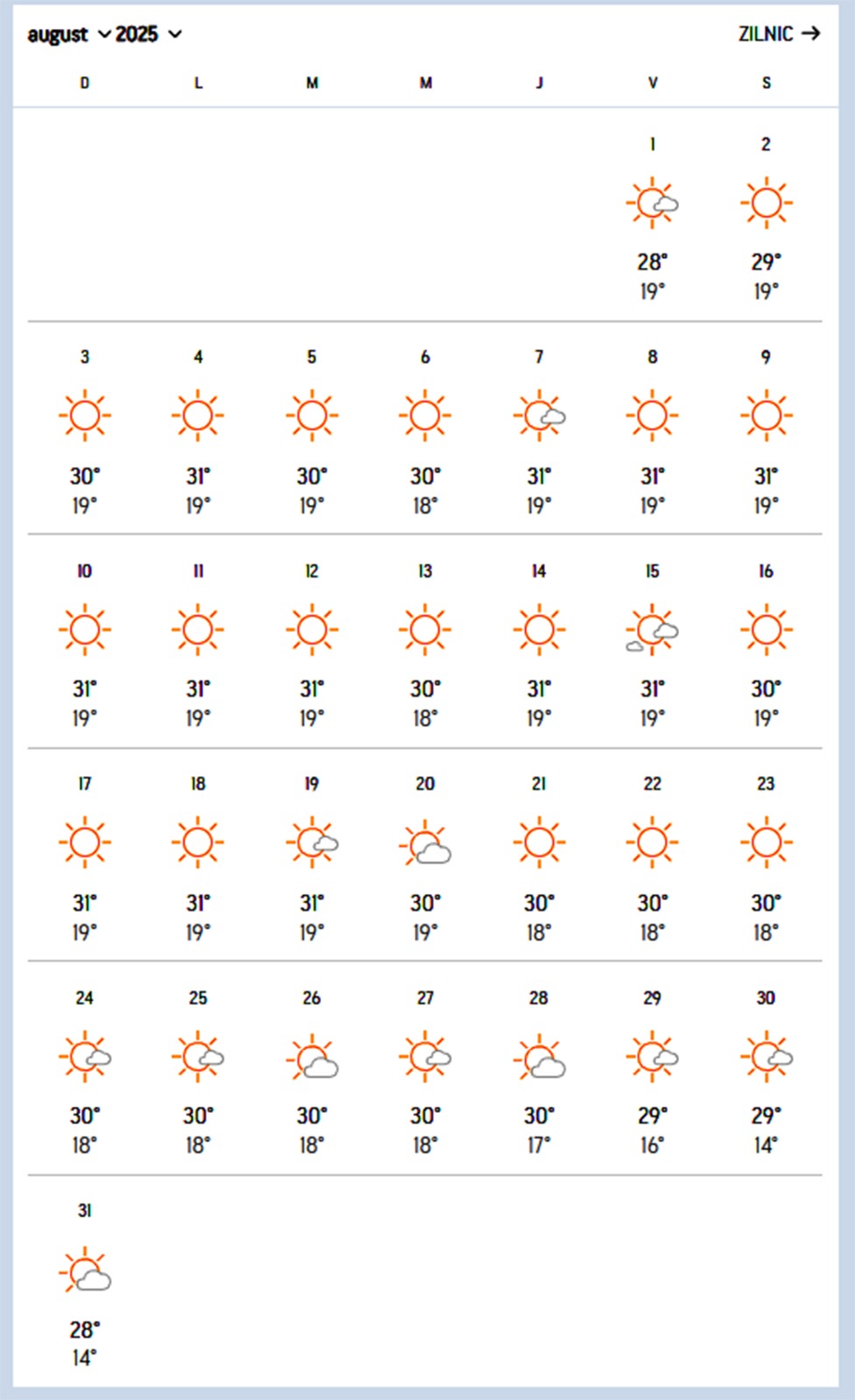 În ceea ce privește aspectul general al vremii, majoritatea zilelor sunt însorite, cu cer variabil. Este important de precizat faptul că nu se anunță episoade de caniculă și nici furtuni severe. Singura zi ușor instabilă apare pe 15 august, când sunt semnalate posibile înnorări.