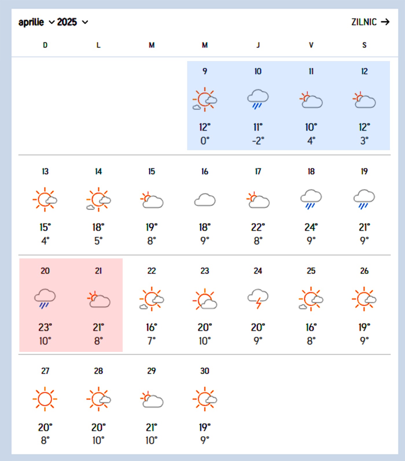 Spre sfârșitul săptămânii, duminică, 13 aprilie, chiar în ziua de Florii, vremea va începe să se încălzească simțitor. Temperaturile vor urca ușor și sunt așteptate maxime de până la 19 grade Celsius și minime cuprinse între 4 și 9 grade Celsius.