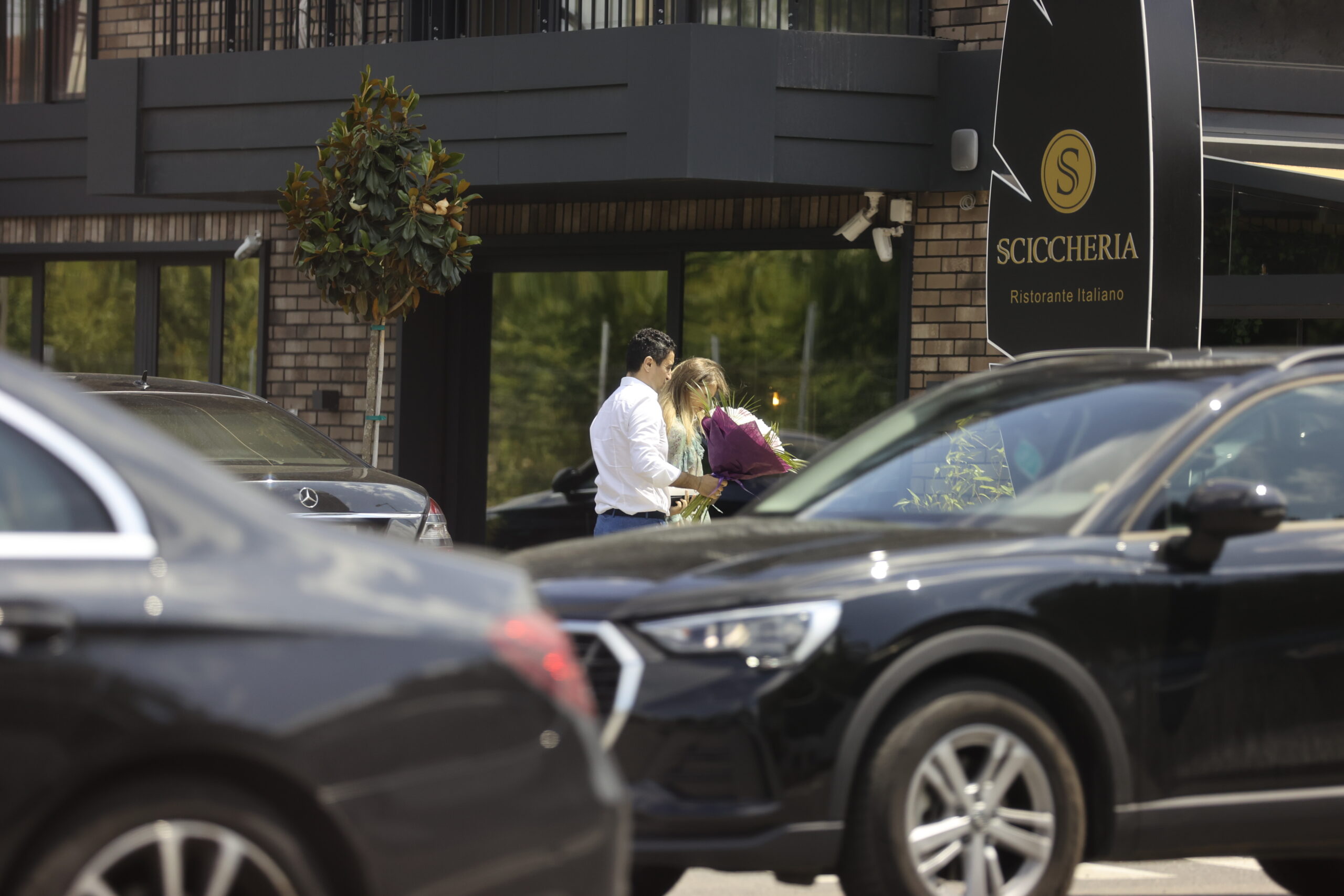 Lucian și soția lui, care ținea în mână un superb buchet de flori, au ”driblat” mașinile din fața restaurantului și s-au ”furișat” la masă, nu înainte de a face urările de rigoare sărbătoritului.