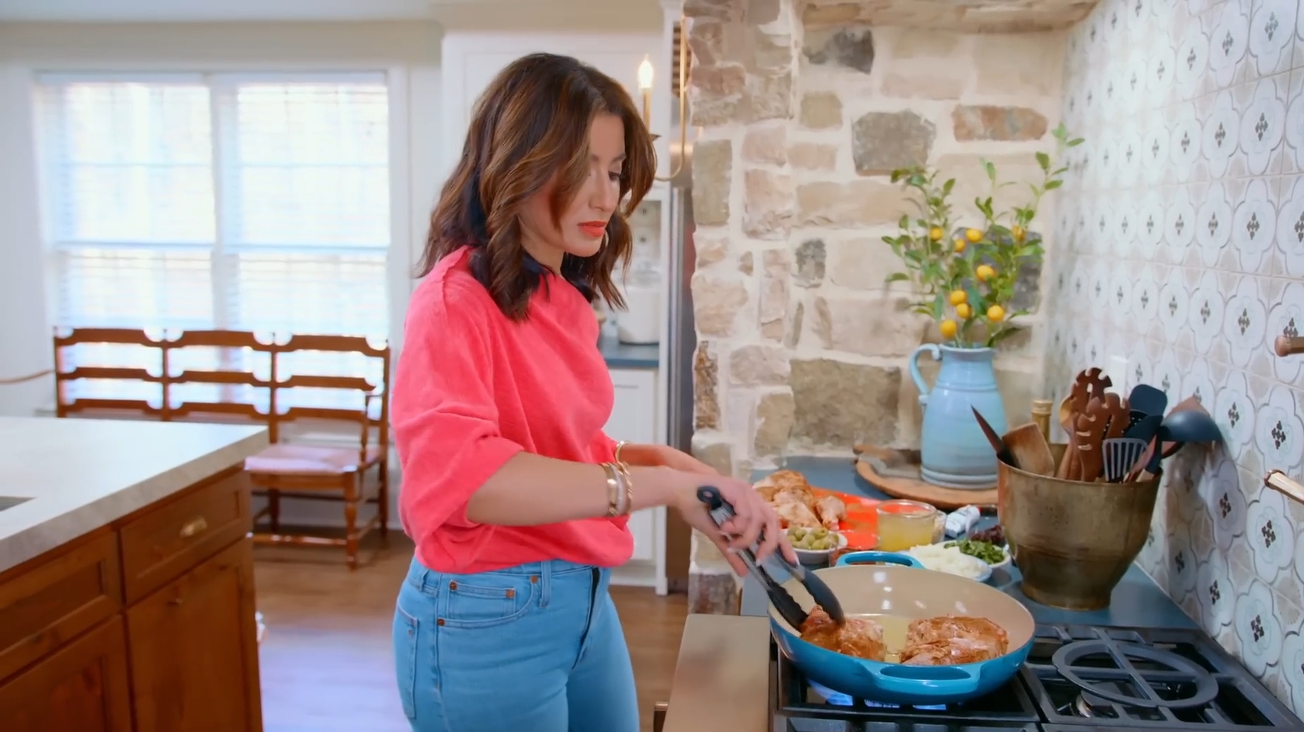 Urmează momentul în care preparatul prinde viață. Se adaugă supa de pui, coriandrul proaspăt, lămâia sau lămâia murată, stafidele, caisele și măslinele. Toate aceste ingrediente creează un sos complex, în care dulcele fructelor se împletește cu săratul măslinelor și cu aciditatea delicată a lămâii.