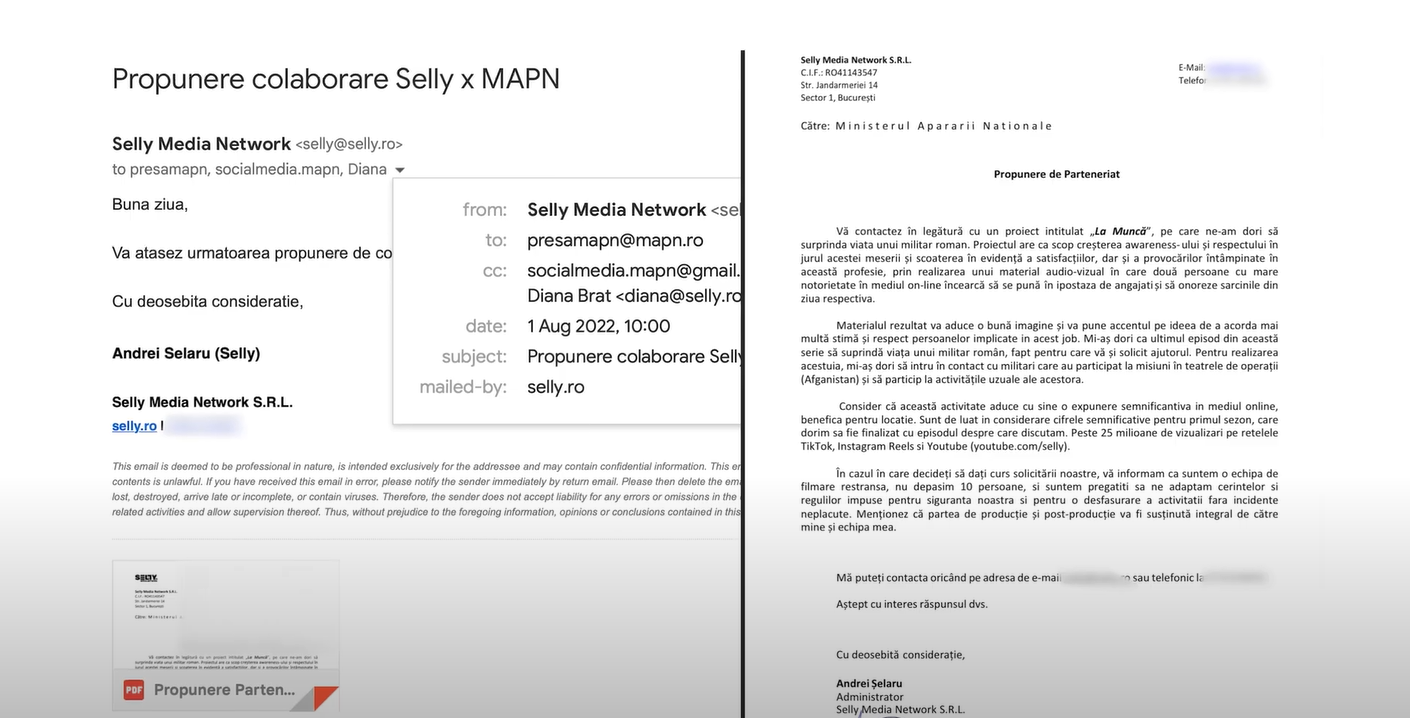 „Referitor la colaborarea dintre MApN și Selly Media Network SRL, reprezentată de domnul Andrei Șelaru (Selly), vă informăm că filmările au fost realizate, la solicitarea societății media amintite, pentru un proiect de tip vlog intitulat „La muncă”, în cadrul căruia a fost realizat un episod dedicat prezentării profesiei de militar al Armatei României. Colaborarea s-a realizat fără implicații de ordin financiar pentru MApN, în baza Instrucțiunilor privind activitatea de informare și relații publice în Ministerul Apărării Naționale, aprobate prin Ordinul nr. M 103 din 21 mai 2020”, a fost reacția oficială a Armatei Române.