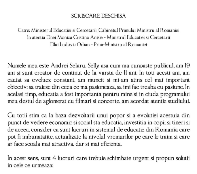 Selly a postat pe rețelele de socializare o scrisoare prin care cere ca sistemul de învățământ să fie schimbat. În opinia vloggerului, școala din România nu-i ajută pe tineri să evolueze, ci doar îi îndobitocește.