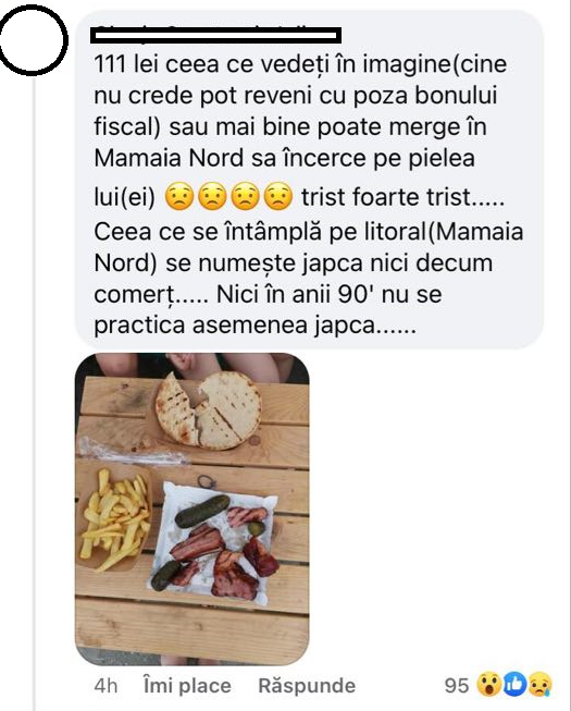 ”111 lei ceea ce vedeți în imagine (cine nu crede pot reveni cu poza bonului fiscal) sau mai bine poate merge în Mamaia Nord să încerce pe pielea lui(ei) ???? trist, foarte trist….. Ceea ce se întâmplă pe litoral (Mamaia Nord) se numește japcă nicidecum comerț….. Nici în anii 90′ nu se practica asemenea japcă”, este mesajul scris de bărbat. Iar în dreptul mesajului, a atașat în comentarii o imagine cu o porție de cartofi prăjiți, pâine, castraveți murați și câteva bucățele de carne.