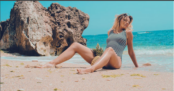 În imagine, blondina apare cu un… ananas între picioare! Un fan nu s-a putut abţine şi i-a scris: „Sunt invidios pe ananasul ăla!”.