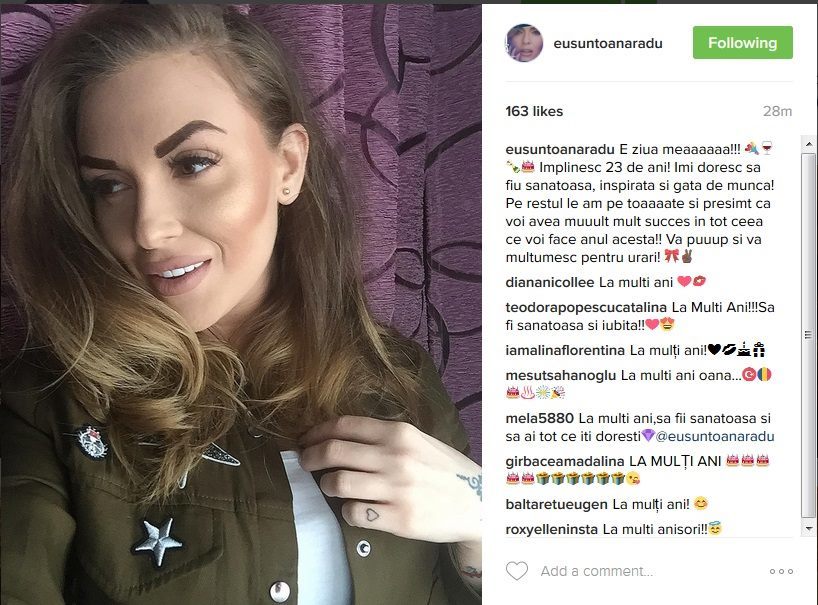 ”E ziua meaaaaaa!!! Implinesc 23 de ani! Îmi doresc să fiu sănătoasă, inspirată şi gata de muncă! Pe restul le am pe toaaaate şi presimt că voi avea muuult mult succes în tot ceea ce voi face anul acesta!! Va puuup şi va mulţumesc pentru urări!” a încheiat Oana, într-o notă optimistă. Mesajele fanilor de felicitare au început apoi să curgă. Oana Radu s-a transformat complet în ultimii trei ani, după ce a izbutit să slăbească 65 de kilograme. Şi-a operat braţele, şi-a pus silicoane şi şi-a refăcut complet dantura. (Gabriel Niculescu)