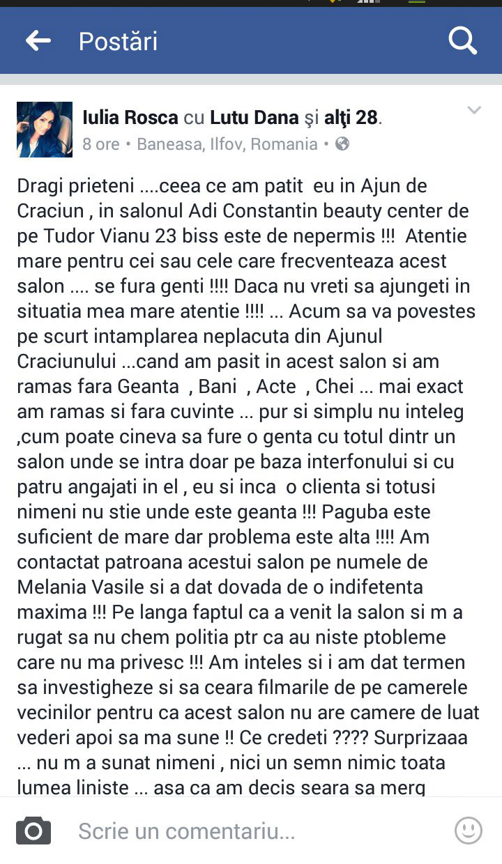 ”Dragi prieteni ….ceea ce am patit eu in Ajun de Craciun , in salonul Adi Constantin beauty center de pe Tudor Vianu 23 biss este de nepermis !!! Atentie mare pentru cei sau cele care frecventeaza acest salon …. se fura genti !!!! Daca nu vreti sa ajungeti in situatia mea mare atentie !!!! … Acum sa va povestesc pe scurt intamplarea neplacuta din Ajunul Craciunului …cand am pasit in acest salon si am ramas fara Geanta , Bani , Acte , Chei … mai exact am ramas si fara cuvinte … pur si simplu nu inteleg ,cum poate cineva sa fure o genta cu totul dintr-un salon unde se intra doar pe baza interfonului si cu patru angajati in el , eu si inca o clienta si totusi nimeni nu stie unde este geanta !!! Paguba este suficient de mare dar problema este alta !!!! Am contactat patroana acestui salon pe numele de Melania Vasile si a dat dovada de o indiferenta maxima !!! Pe langa faptul ca a venit la salon si m-a rugat sa nu chem politia ptr ca au niste ptobleme care nu ma privesc !!! Am inteles si i am dat termen sa investigheze si sa ceara filmarile de pe camerele vecinilor pentru ca acest salon nu are camere de luat vederi apoi sa ma sune !! Ce credeti ???? Surprizaaa … nu m a sunat nimeni , nici un semn nimic toata lumea liniste … asa ca am decis seara sa merg frumos la politie si sa depun plangere si am mare incredere ca , pe cale legala se va rezolva acest mister nici in momentul de fata nu inteleg atitutinea acestor oameni ..de parca acest lucru … sa te fure cineva in casa ta este f normal !!!! Acum cred toate fetele care s au mai plans ca au ramas fara bani, tot in acel salon si multe alte zvonuri…. Adi Constantin eu te am considerat prieten dar tacerea si atitudinea ma fac sa dau dreptate altora !!!!N am sa ma las pana nu scot adevarul la iveala !!!! Va pup si mare grija !!!! Ps : Apelati la politie daca patiti asa ceva, nu va fie frica … astfel de incidente trebuiesc opritr !!! Dati mai depate ca sa stie lumea de ce sa se fereasca si mare atentie !!!! Va multumesc !!” (Gabriel Niculescu)