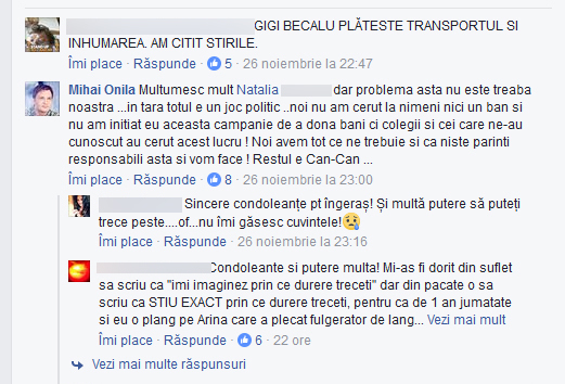 „Multumesc mult, Natalia, dar problema asta nu este treaba noastra. In tara, totul e un joc politic… Noi nu am cerut nici un ban si nu am initiat eu aceasta campanie de a dona bani, cei care ne-au cunoscut au cerut acest lucru! Noi avem tot ce ne trebuie si ca niste parinti responsabili, asta si vom face”, a răspuns Mihai Onilă pe pagina sa de Facebook.
