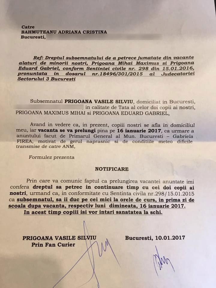 Marţi, Silviu Prigoană i-a trimis o notificare oficială fostei sale partenere de viaţă, prin curier rapid, prin care o anunţă că dreptul său de a-i lua pe gemeni în vacanţa de iarnă tocmai s-a prelungit datorită….vremii neprielnice şi a primarului general al Capitalei, Gabriela Firea! Mai exact, Prigoană profită de vacanţa extinsă chiar de primarul general!. ”Având în vedere că în prezent copiii noştri se află în domiciliul meu iar vacanţa se va prelungi până la 16 ianuarie 2017, ca urmare a anunţului făcut de Primarul General al Municipiului Bucureşti- Gabriela Firea, motivat de gerul năpraznic şi de către condiţiile meteo dificile transmise de către ANM (…) vă comunic faptul că prelungirea vacanţei anunţate îmi conferă dreptul să petrec în continuare timp cu cei doi copii ai noştri, urmând ca (…) subsemnatul să îi duc pe cei mici la orele de curs în prima zi de şcoală după vacanţă respectiv luni dimineaţă, 16 ianuarie 2017. În acest timp copiii îşi vor întări sănătatea la schi” .