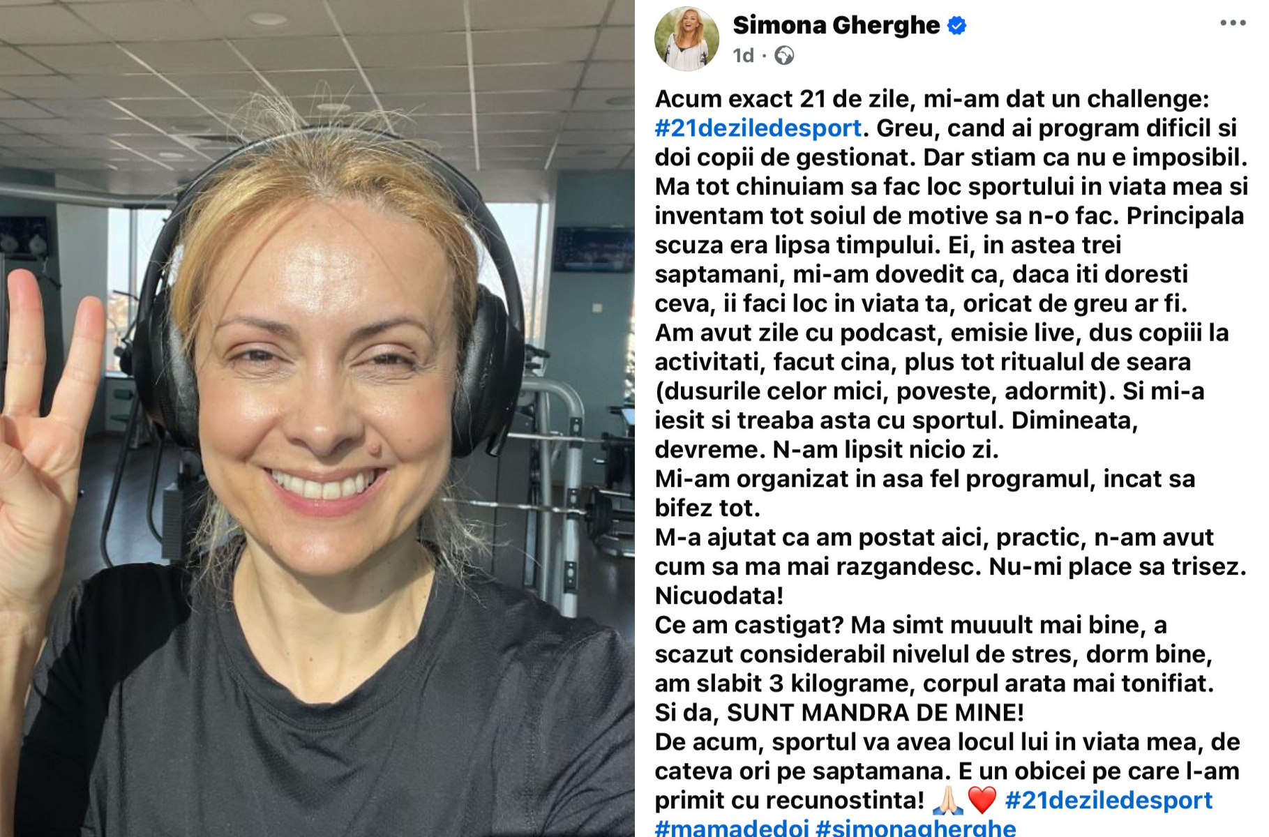 „Acum exact 21 de zile, mi-am dat un challenge: #21deziledesport. Greu, când ai program dicificil și doi copii de gestionat. Mă tot chinuiam să fac loc sportului în viața mea și inventam tot soiul de motive să n-o fac. Principala scuză era lipsa timpului. Ei, în astea trei săptămâni, mi-am dovedit că, dacă îți dorești ceva, îi faci loc în viața ta, oricât de greu ar părea .