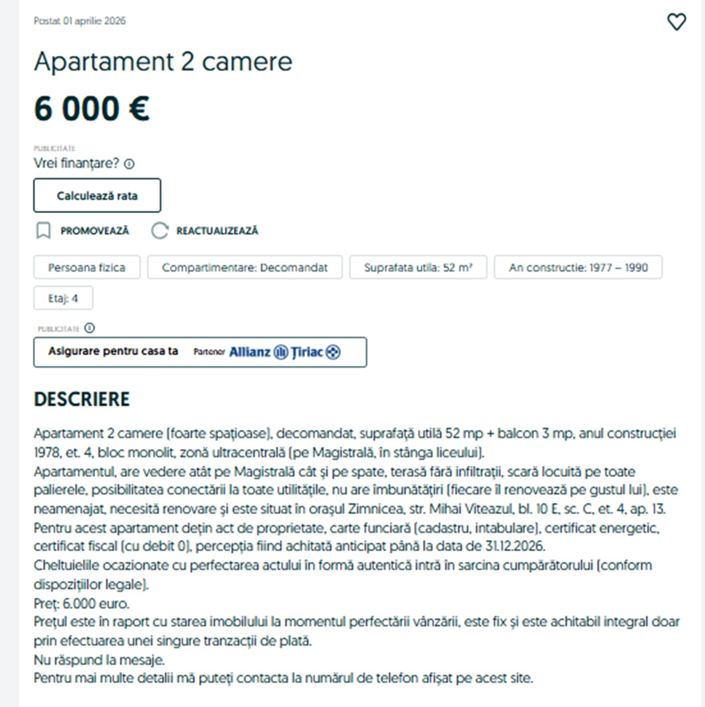 În contextul actual al pieței imobiliare din România, unde prețurile apartamentelor au cunoscut creșteri semnificative în ultimele luni, o ofertă ieșită din comun atrage atenția cumpărătorilor: un apartament de două camere situat în centrul orașului Zimnicea, județul Teleorman, este scos la vânzare pentru doar 6.000 de euro.
