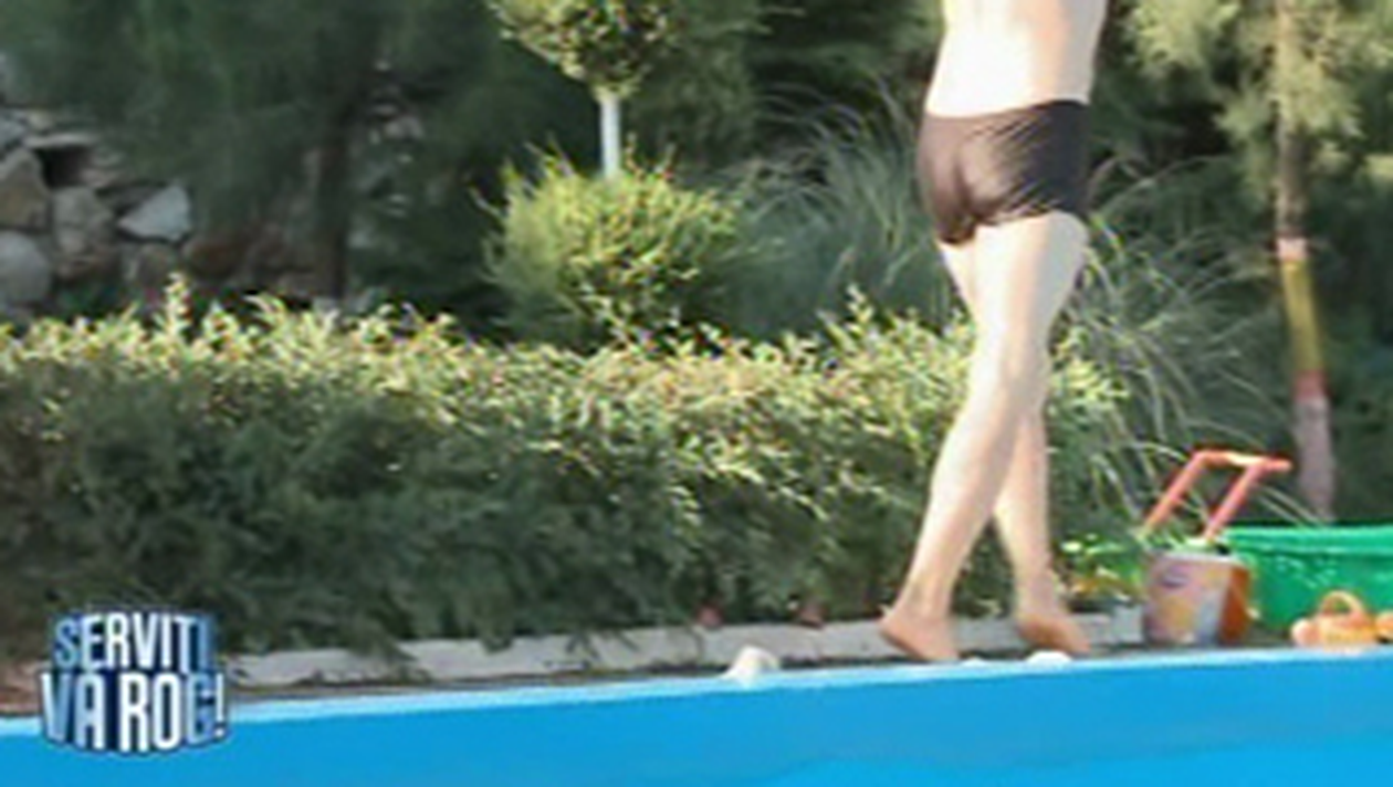 Solcanu si-a pus slipul si a plonjat in piscina de la 2 Mai, alaturi de Matteo. In jur pluteau cateva ratuste de plastic, dar gazda emisiunii, Nea Marin, nu a parut ca apreciaza activitatea celor doi, asa ca a incercat sa ii scoata din apa cu o nuia in mana.