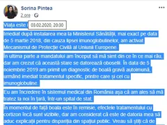 În ultima parte a mandatului am început să mă simt din ce în ce mai rău, dar am crezut că această stare se datorează oboselii. În data de 5 noiembrie 2019, am primit un diagnostic de boală gravă autoimună, urmând imediat tratamentul specific, printre care și cel cu imunoglobuline.