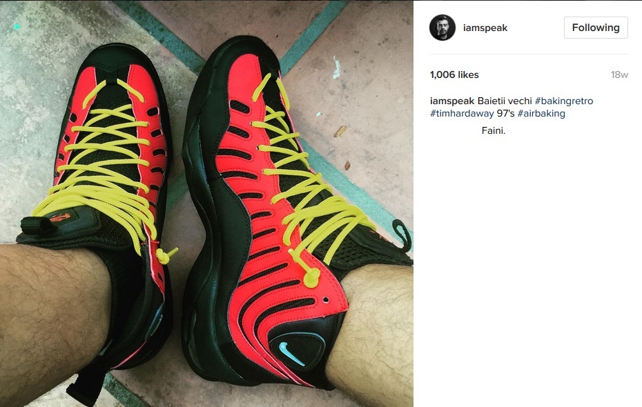 ”Abia v-am aşteptat! Uptempo. Lakers. Restock. Frustrările copilăriei” / ”Băieţii vechi. Tim Hardway ’97” / ”Dependent de bascheţi” / ”Yuhuuu. Cei mai vechi adidaşi” / ”Air Jordan 10. Colecţia veche. Prietenii ştiu de ce”, sunt doar câteva dintre hashtagurile cu care Speak îşi descrie perechile favorite de bascheţi cu care s-a lăudat prietenilor pe reţelele de socializare.