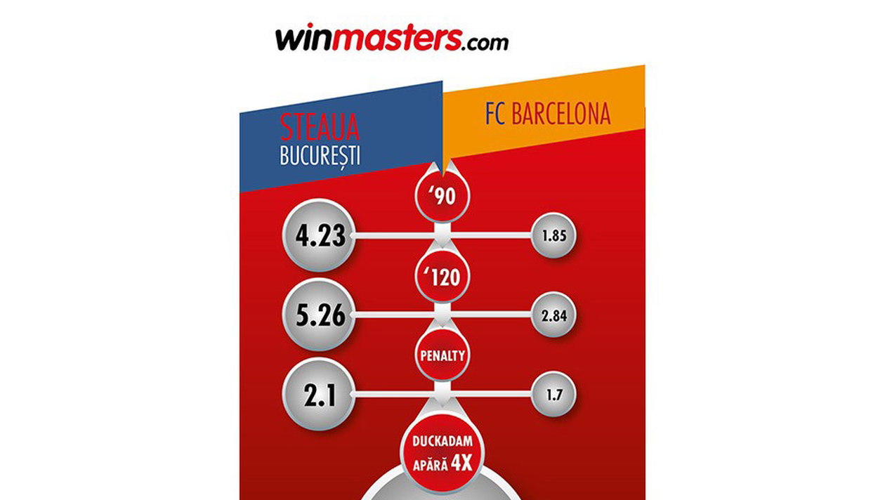 Cum primele 90 de minute s-au terminat la egalitate, cotele s-au schimbat pentru victoria în prelungiri: 2.84 pentru FC Barcelona şi 5.26 pentru Steaua.