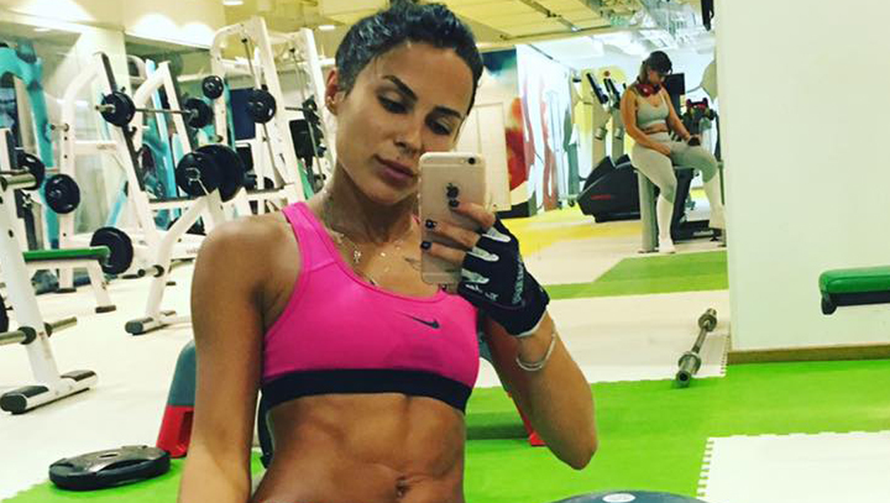 Ioana Tamaş îşi lucrează intens corpul în sala de fitness.