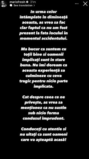 „În urma celor întâmplate în dimineața aceasta, aș vrea să fac clar faptul că nu am fost prezent la fața locului în momentul accidentului. Mă bucur că suntem cu toții bine și oamenii implicați sunt în stare bună. Nu îmi doream ca această experiență să culmineze cu ceva tragic pentru nicio parte implicată. Cât despre ceea ce ne privește, aș vrea să menționez că nu susțin sub nicio formă condusul imprudent. Conduceți cu atenție și nu uitați că sunt oameni care vă așteaptă acasă”, a fost mesajul lui Mario Fresh.