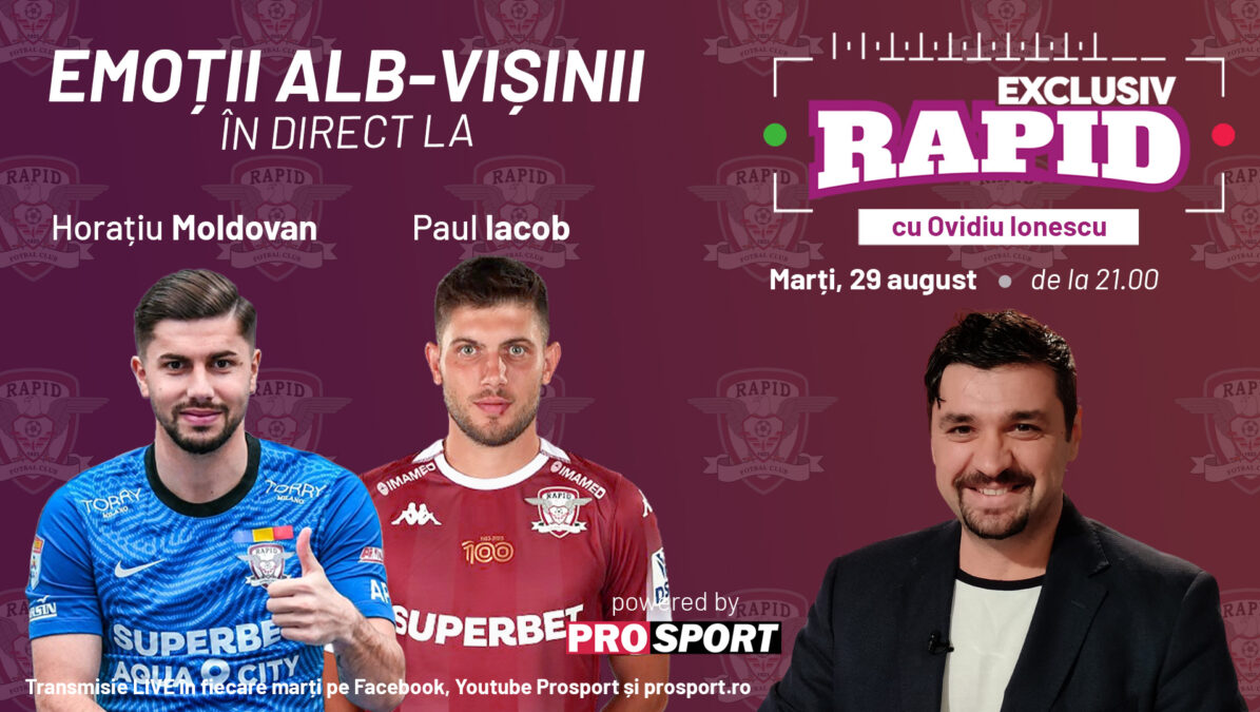 EXCLUSIV Rapid continuă în a doua zi a acestei săptămâni. În urmă cu șapte zile, în cadrul primului episod al noii emisiuni de la ProSport, în platou cu Ovidiu Ionescu au fost Daniel Niculae, președintele din Giulești, și Cristi Săpunaru, sufletul echipei. De această dată, marți, 29 august, de la ora 21.00, suporterii rapidiști îi vor avea în față pe Horațiu Moldovan și Paul Iacob, doi din stâlpii defensivei lui Cristiano Bergodi, la doar câteva zile de la „thriller-ul” din Bănie, cu FCU Craiova.