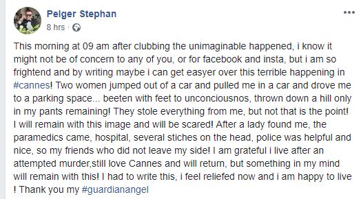 „În această dimineață (duminică, 12 august n.r), la ora 9 dimineața, s-a întâmplat ceva inimaginabil în timp ce mă întorceam dintr-un club. Știu că ar putea să nu fie niciun motiv de îngrijorare pentru voi sau pentru Facebook și Insta, dar sunt atât de speriat încât scriind despre asta poate pot trece mai repede peste acest incident teribil, care a avut loc la Cannes. Două femei au sărit dintr-o mașină și m-au tras înăuntru și m-au condus într-o parcare. M-au bătut cu picioarele până am leșinat și m-au aruncat îmbrăcat doar în pantaloni. Mi-au furat totul, dar nu asta este important!