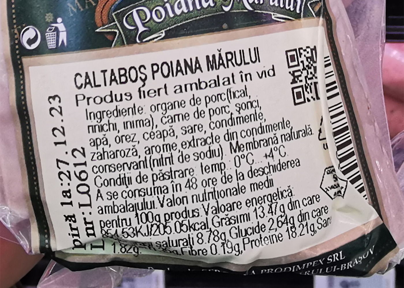 De exemplu, în magazinele Auchan din țară se regăsește caltaboșul „Poiana Mărului”. Conform ambalajului, este vorba despre un produs fiert ambalat în vid. Însă, ce conține, de fapt? La o primă vizualizare a etichetei, așa cum ar trebui să se regăsească pentru majoritatea produselor, se poate observa o listă cu ingrediente. Iată care sunt acestea: