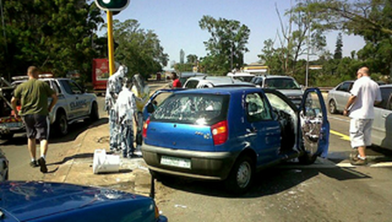 Ei aveau in spatele masinii mai multe bidoane cu 25 de litri de vopsea, care in momentul impactului au zburat care incotro, varsandu-se si improscandu-i cu culoare alba. Accidentul a avut loc in provincia KwaZulu. Dupa incident, cei implicati au fost fericiti ca au scapat cu viata si chiar s-au amuzat de look-ul lor complet alb.